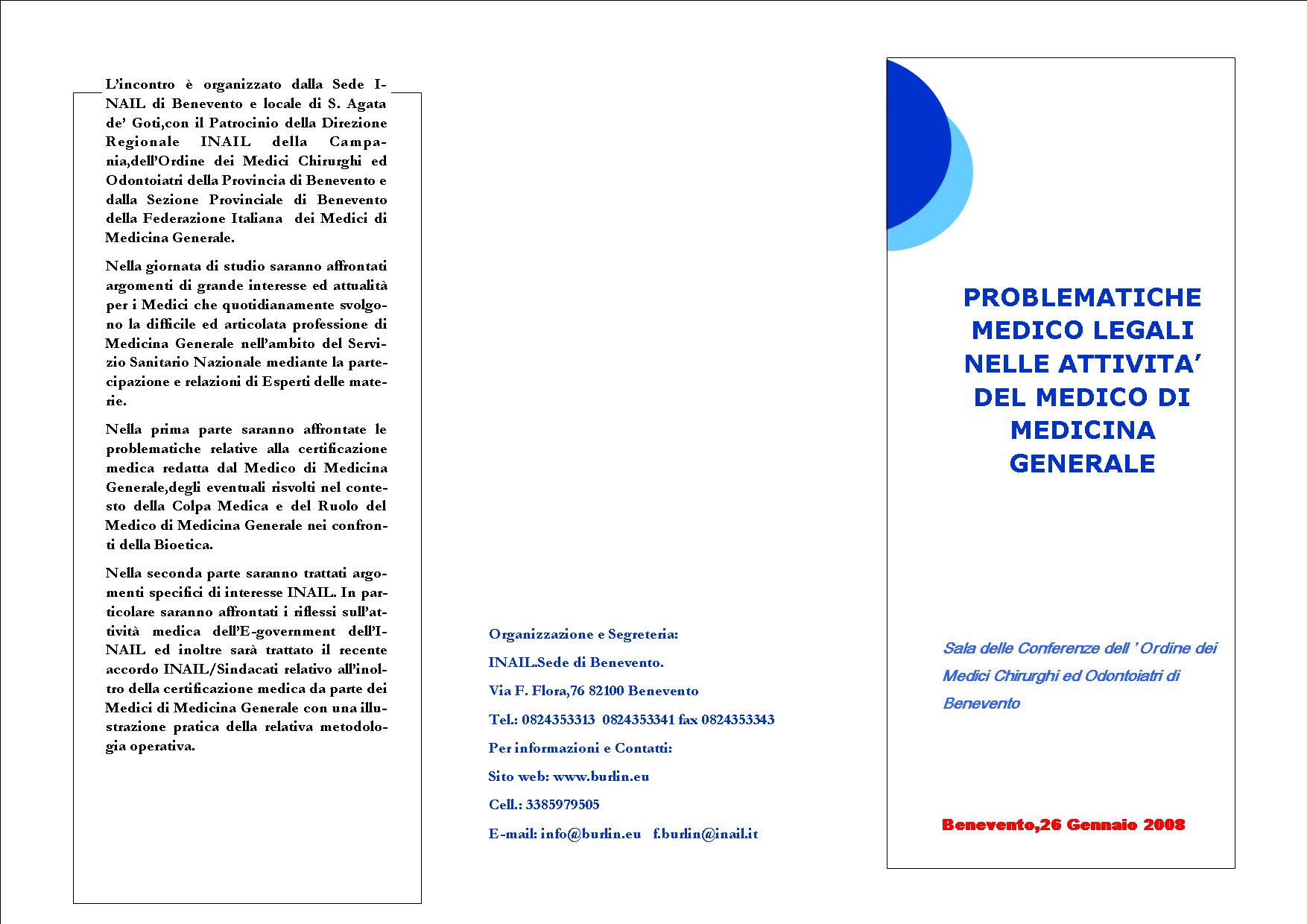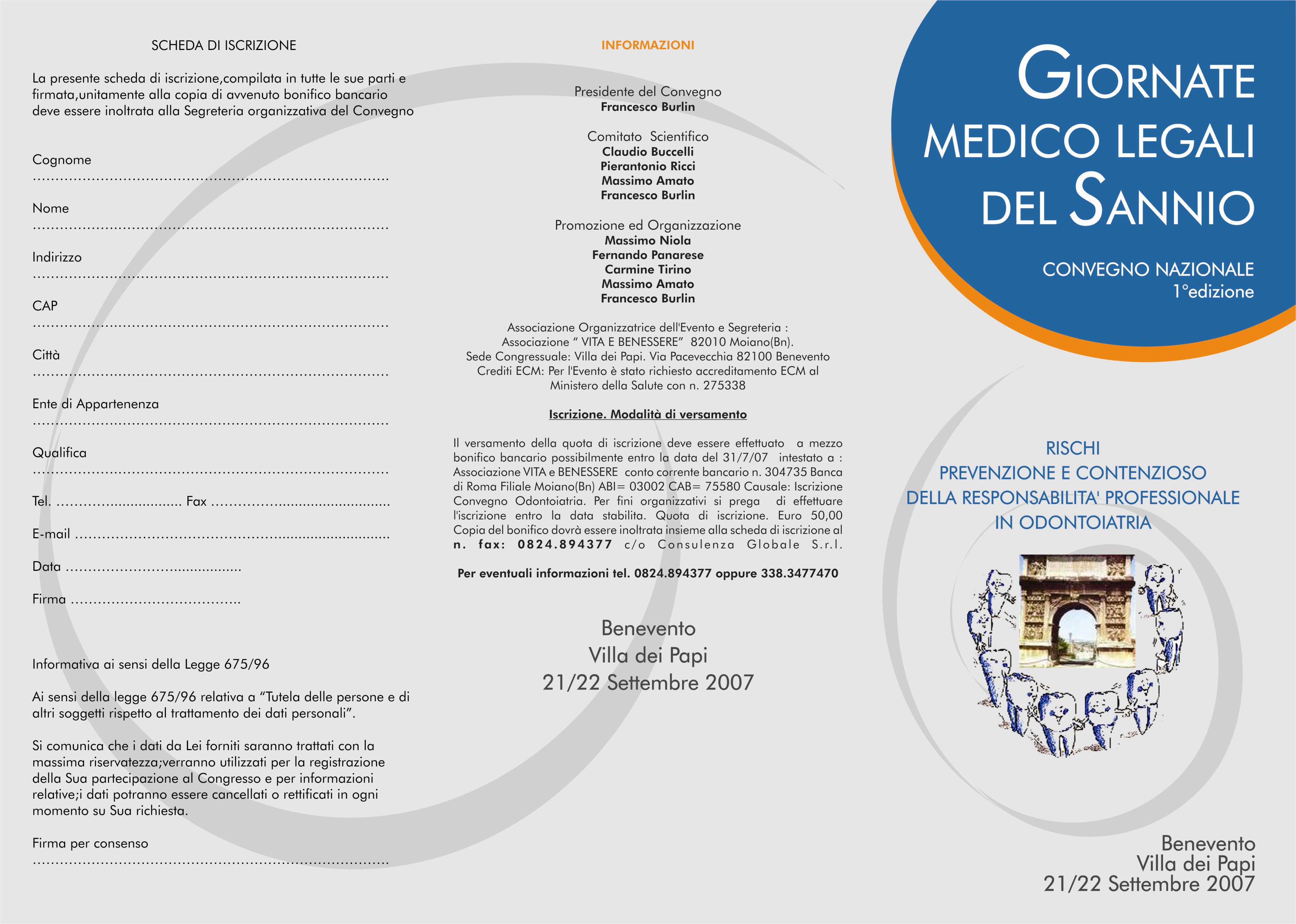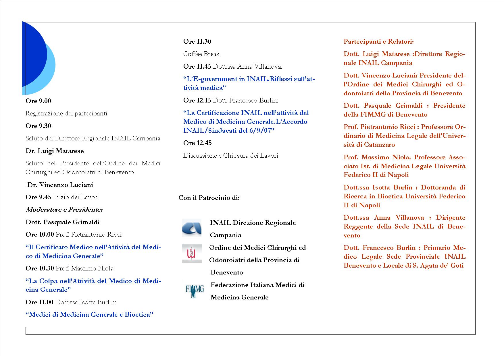 AIRM 8-11 GIUGNO 2005 TUTELA DELLA PRIVACY ED ATTIVITÀ SANITARIA CENTRO CONGRESSI TELESE TERME (BN) Scarica il PROGRAMMA e la scheda d'iscrizione NEOPLASIE E LAVORO GAETA 31 MARZO 2006 IL RUOLO DELLA MEDICINA TERRITORIALE NELLA TUTELA E NELLA PREVENZIONE DELLE MALATTIE PROFESSIONALI NAPOLI AUDITORIUM ORDINE DEI MEDICI 24-25 NOVEMBRE 2006 CONGRESSO NAZIONALE 21-22 SETTEMBRE 2007 CONVEGNO NAZIONALE Settimana Europea per la Salute e la Sicurezza sul Lavoro Napoli.13/25 Ottobre 2007.Aula Magna del Policlinico Università Federico II Scarica il Programma: BrochureAnte BrochurePost Incontro Dibattito: LA CELIACHIA IN CAMPANIA QUALE FUTURO? Apollosa(Bn) 26 Novembre 2007 Brochure PROBLEMATICHE MEDICO LEGALI NELLE ATTIVITA' DEL MEDICO DI MEDICINA GENERALE Benevento. 26 Gennaio 2008. Sala delle Conferenze dell'Ordine dei Medici Chirurghi ed Odontoiatri. Scarica il Programma: BrochureAnte BrochurePost Scheda Iscrizione Invito
