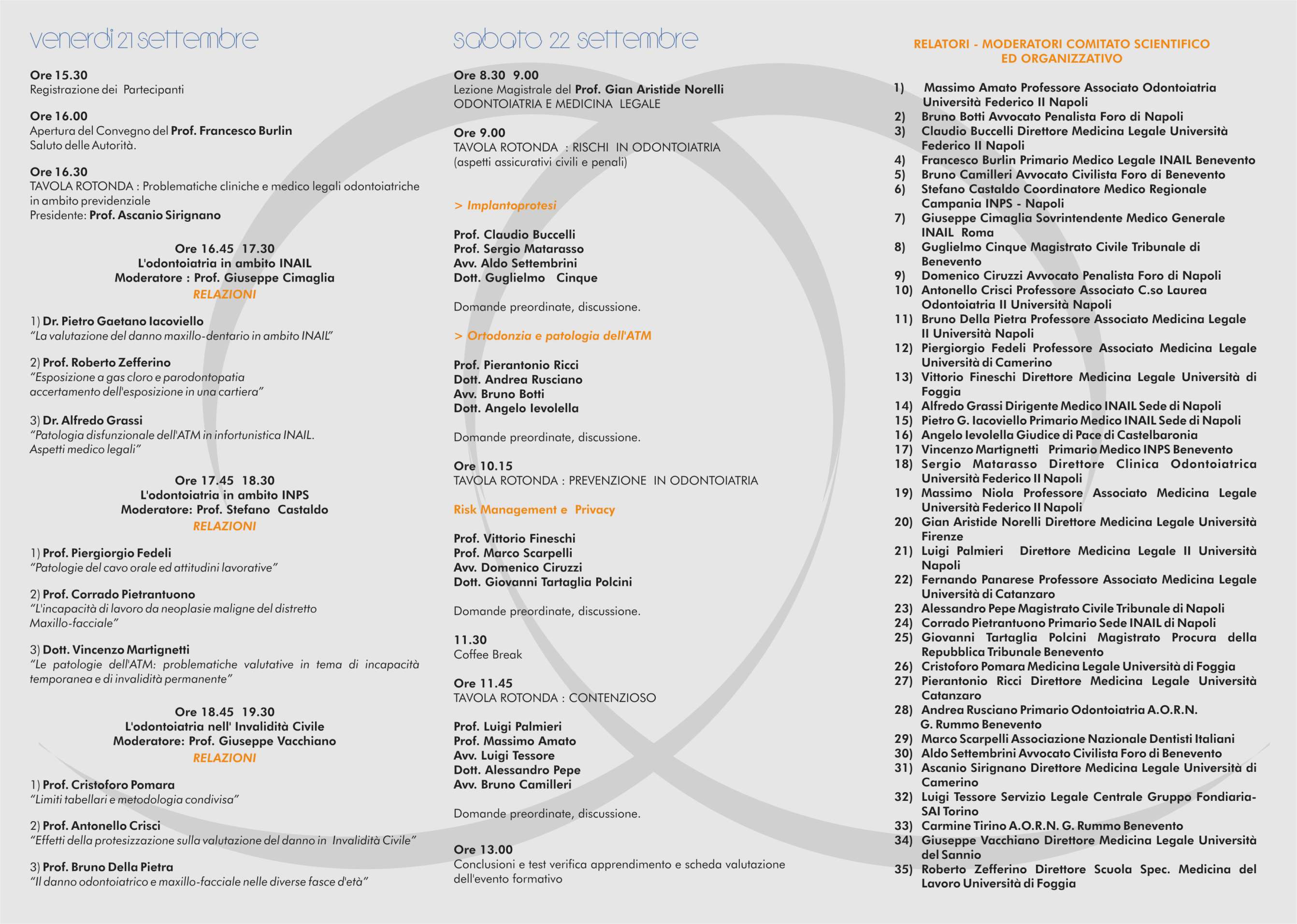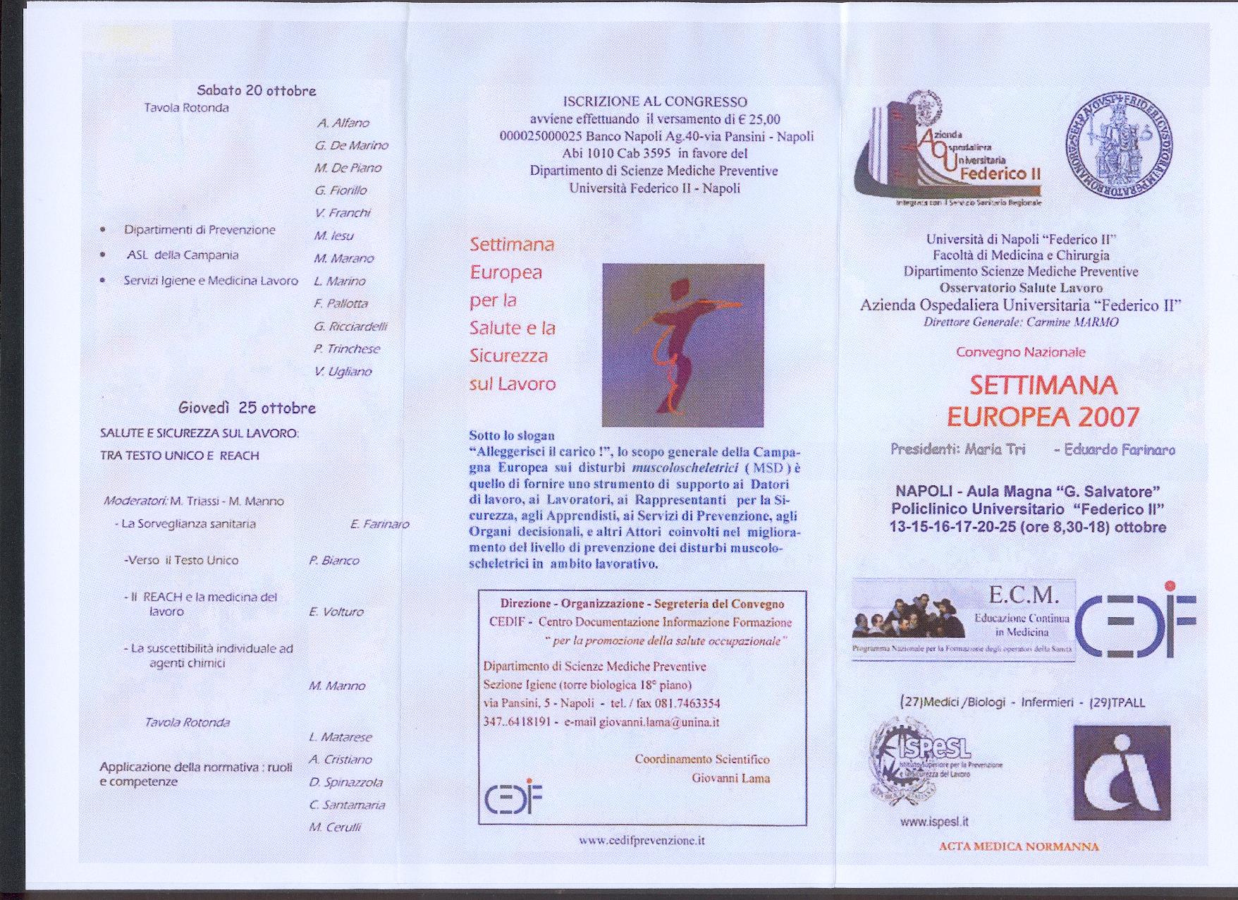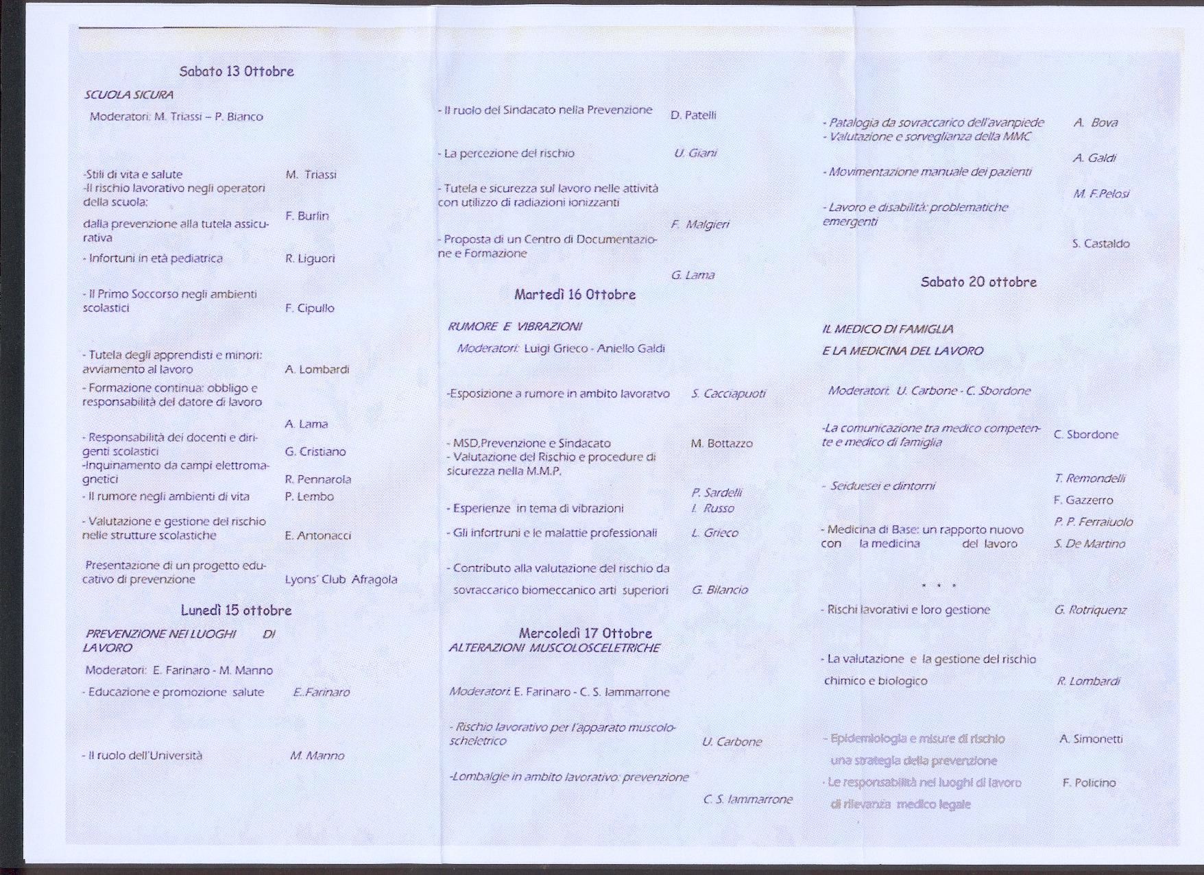 AIRM 8-11 GIUGNO 2005 TUTELA DELLA PRIVACY ED ATTIVITÀ SANITARIA CENTRO CONGRESSI TELESE TERME (BN) Scarica il PROGRAMMA e la scheda d'iscrizione NEOPLASIE E LAVORO GAETA 31 MARZO 2006 IL RUOLO DELLA MEDICINA TERRITORIALE NELLA TUTELA E NELLA PREVENZIONE DELLE MALATTIE PROFESSIONALI NAPOLI AUDITORIUM ORDINE DEI MEDICI 24-25 NOVEMBRE 2006 CONGRESSO NAZIONALE 21-22 SETTEMBRE 2007 CONVEGNO NAZIONALE Settimana Europea per la Salute e la Sicurezza sul Lavoro Napoli.13/25 Ottobre 2007.Aula Magna del Policlinico Università Federico II Scarica il Programma: BrochureAnte BrochurePost Incontro Dibattito: LA CELIACHIA IN CAMPANIA QUALE FUTURO? Apollosa(Bn) 26 Novembre 2007 Brochure PROBLEMATICHE MEDICO LEGALI NELLE ATTIVITA' DEL MEDICO DI MEDICINA GENERALE Benevento. 26 Gennaio 2008. Sala delle Conferenze dell'Ordine dei Medici Chirurghi ed Odontoiatri. Scarica il Programma: BrochureAnte BrochurePost Scheda Iscrizione Invito